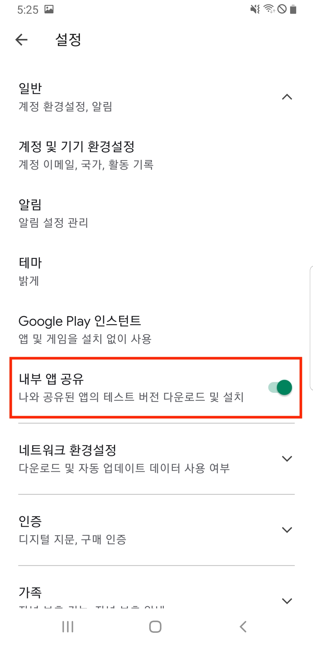 완료되면 일반 탭에 가셔서 내부 앱 공유를 열어주실 수 있습니다.