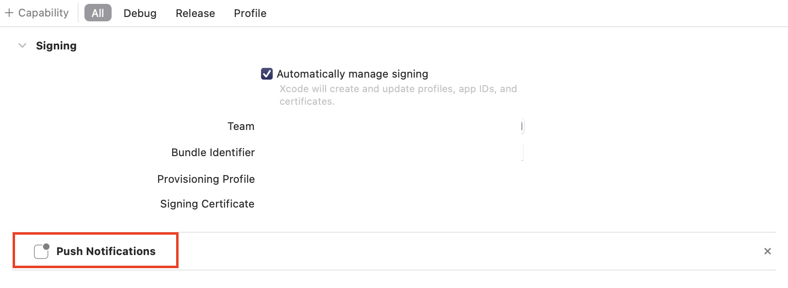 Signing의 아래쪽에 Push Notifications가 정상적으로 추가되었다면 다시 빌드해주도록 합니다.