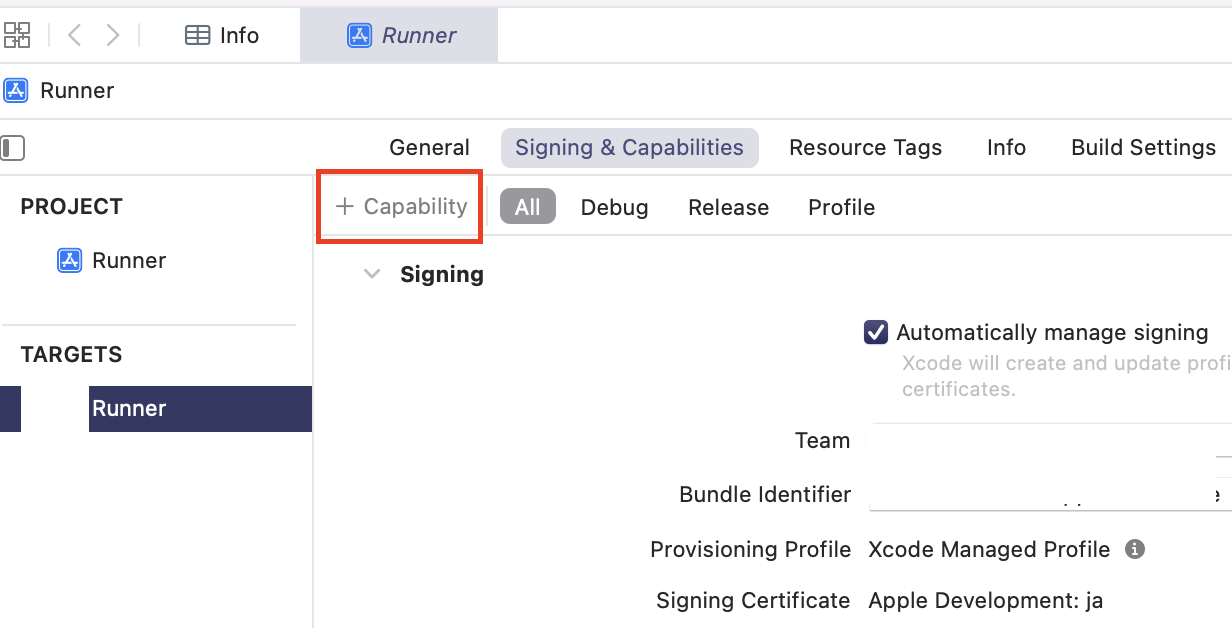 Xcode를 통해 프로젝트를 열고 Targets - Runner - Signing & Capabilities 로 가서 Capability를 추가해주도록 합니다.