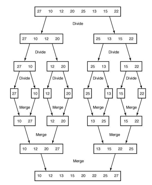 27, 10, 12, 20, 25, 13, 15, 22로 구성된 배열을 nondecreasing order(오름차순)로 정렬하는 Merge Sort는 다음과 같습니다.