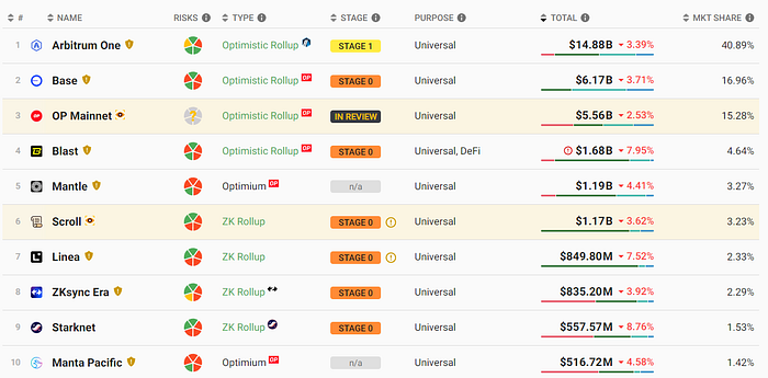 2022년 이더리움의 창시자 비탈릭 부테린은 롤업과 관련되어 하나의 제안을 한 적이 있습니다. 일종의 레이어 2 롤업 프로젝트들이 달성할 목표와 같은 것인데, 레이어 2 프로젝트들의 정보를 모아 제공하는 L2beat 팀은 비탈릭이 제안한 마일스톤을 통해 프로젝트를 평가하고, 달성도를 표기하고 있습니다.