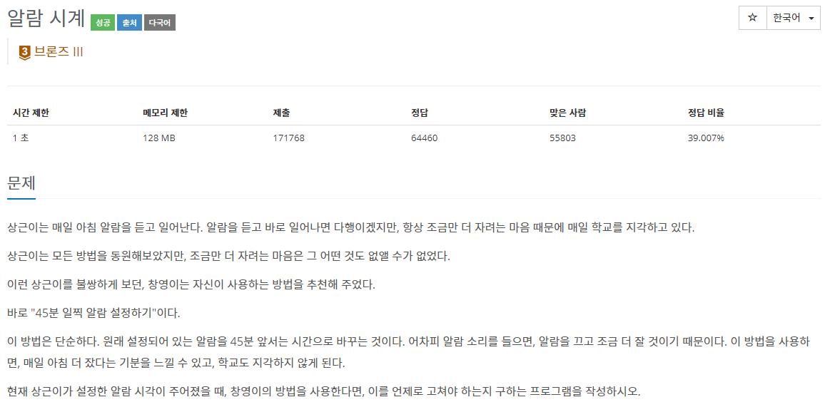 BOJ 2884번 알람 시계 Go Lang 문제풀이입니다.