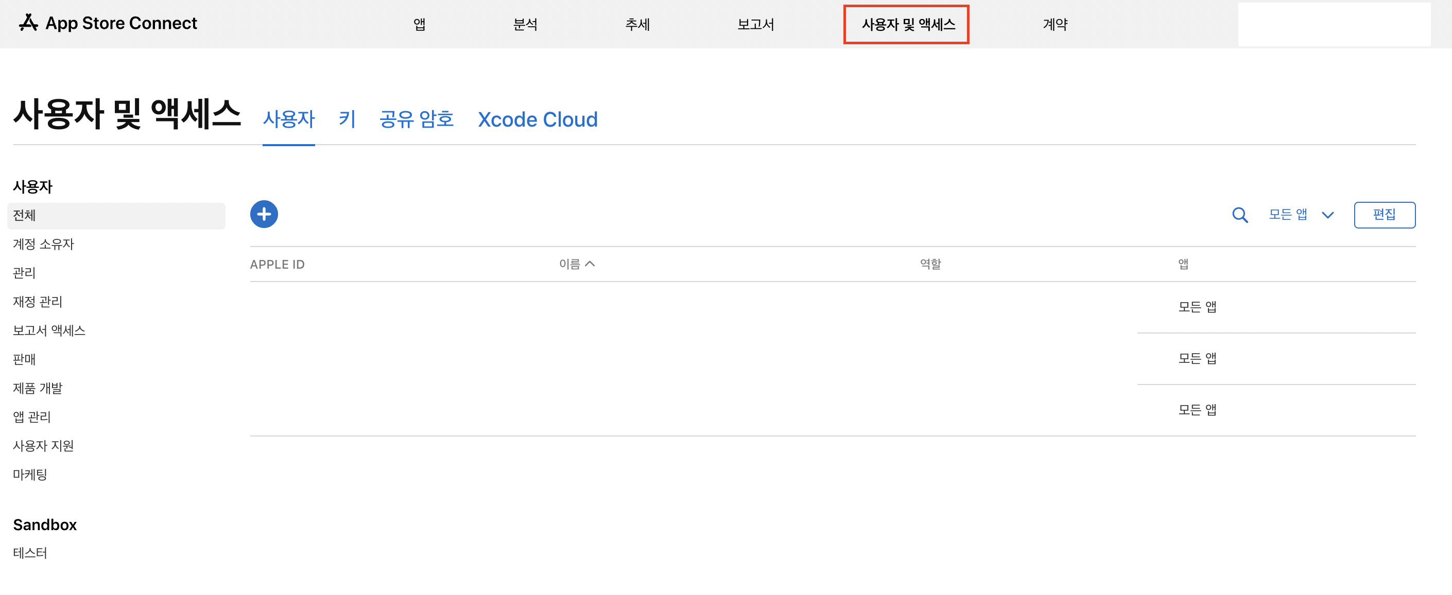 우선 테스트할 앱을 빌드하고나서 developer.apple.com을 통해 App Store Connect로 들어갑니다.