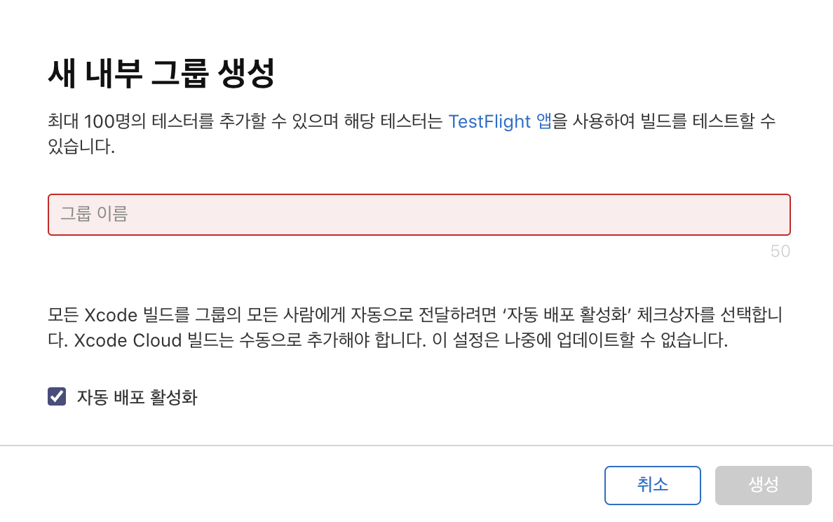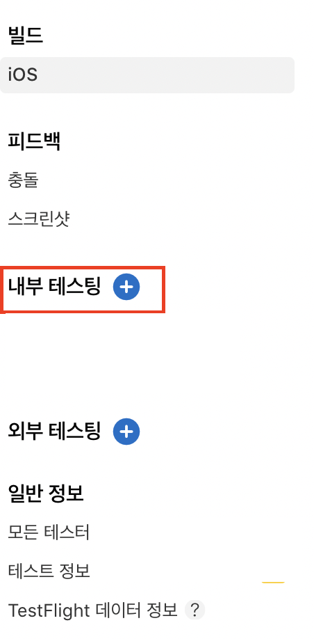 TestFlight에서 내부 테스팅에 + 를 눌러 테스팅 그룹을 먼저 추가해줍니다.
