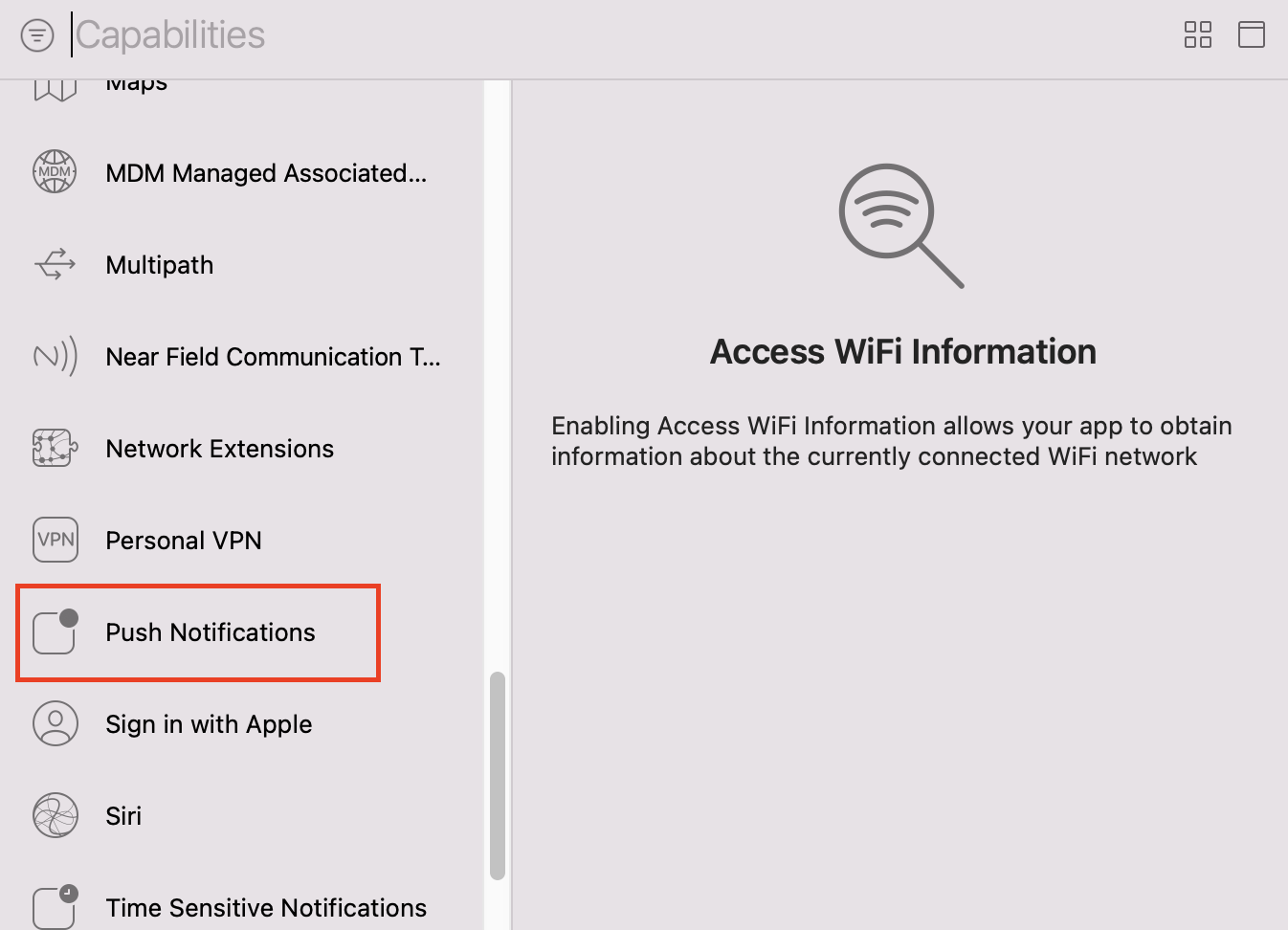 Push Notifications를 찾아서 더블 클릭을 통해 추가해주도록 합시다.