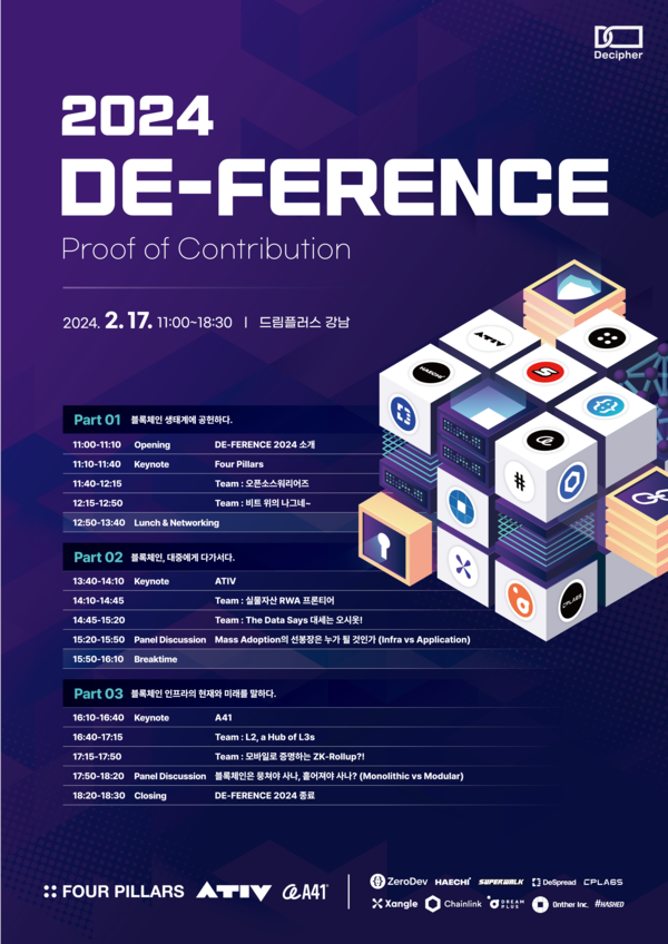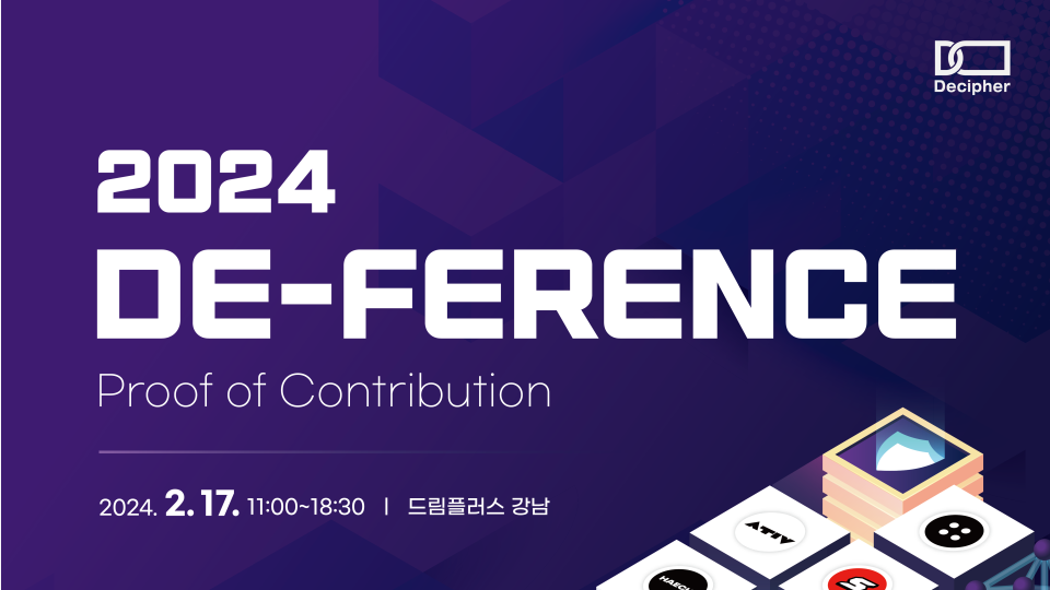 디퍼런스 2024는 서울대학교 기반의 블록체인학회 Decipher에서 주최하는 행사입니다. 한 해동안 Decipher 학회원분들이 활동하고 배우고 성취한 내용들을 발표하는 행사로 이번이 7회째라고 합니다. 전국에 각 대학별로 많은 블록체인 학회가 있지만 Decipher하면 특히 이름나있는데, 이번에보니 제가 이전에 알던 로고와 조금 달라졌더라구요.